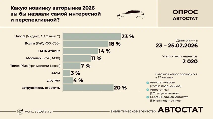 За Umo 5 проголосовали 23% участников, среди которых 80% — специалисты автоиндустрии и автобизнеса. Производство электрокара стартовало совсем недавно на заводе «Москвич». Модель базируется на китайском GAC Aion Y, но выпуском занимается Яндекс. Первая партия электромобилей ориентирована на корпоративные парки такси.